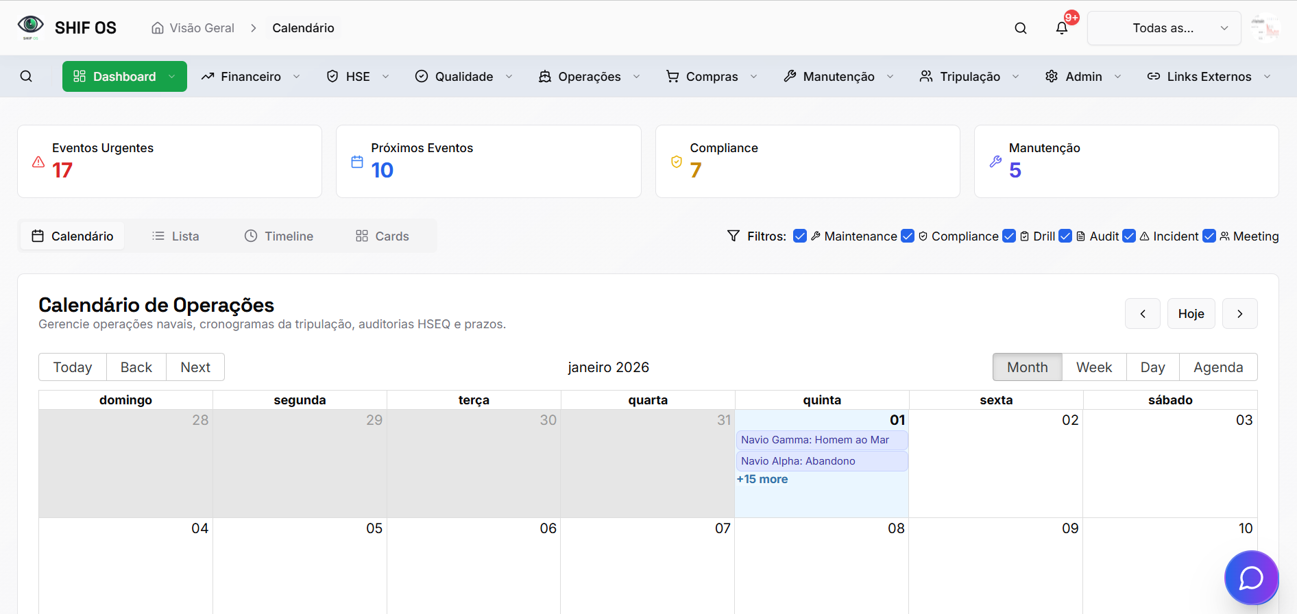 Calendário integrado com visão geral de eventos urgentes, compliance e manutenção